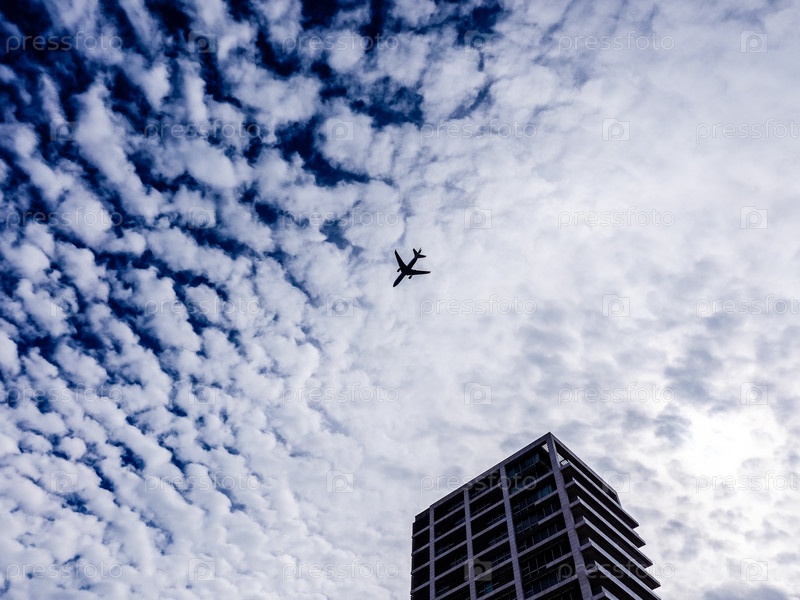 Самолет летит в небе над небоскребом. Тель-Авив, Израиль