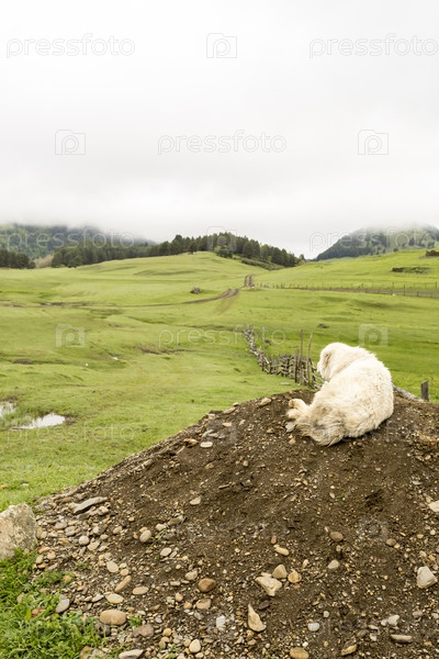 Белая грустная одинокая собака ищет своего хозяина на проселочной дороге. Грузия, Тушети