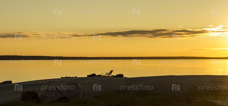 Силуэт шезлонга на пляже. Тихое спокойное море на закате Карелия, Россия. Оранжевый естественный фон
