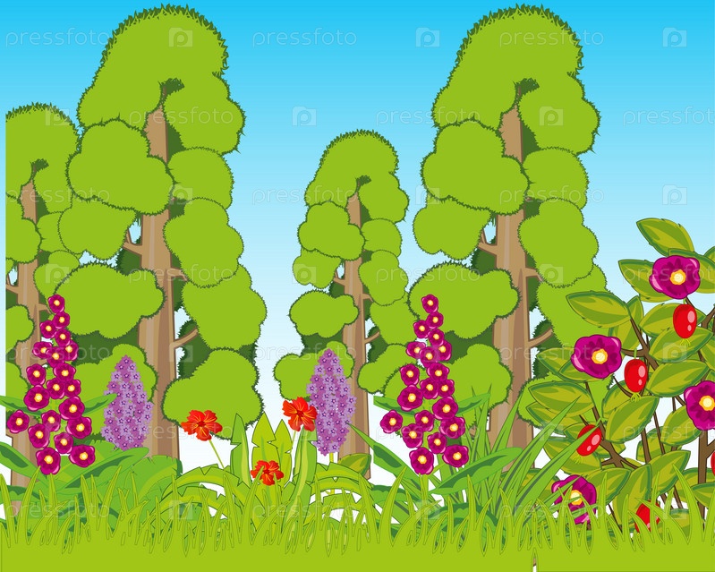 Дерево секвойя и поляна с цветком днем