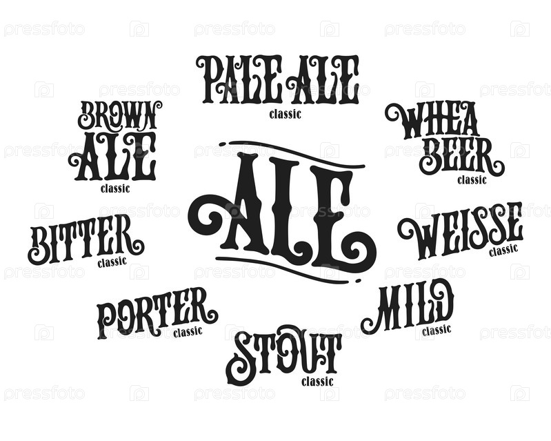 Векторная иллюстрация. Установите типы эля. Эль — сорт пива, который производится путем конного брожения. Установите типы рукописных надписей. Празднование шаблона дизайна