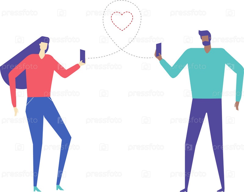 Векторная иллюстрация. Мужчина и женщина со смартфонами отправляют друг другу любовное послание. Плоский дизайн. Празднование шаблона дизайна