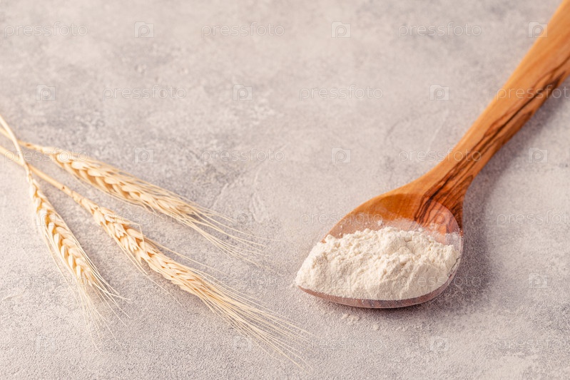 Ингредиенты для выпечки - ложка с мукой, колосья пшеницы
