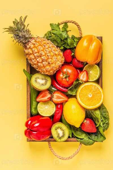Фрукты и овощи, богатые витамином С, в коробке
