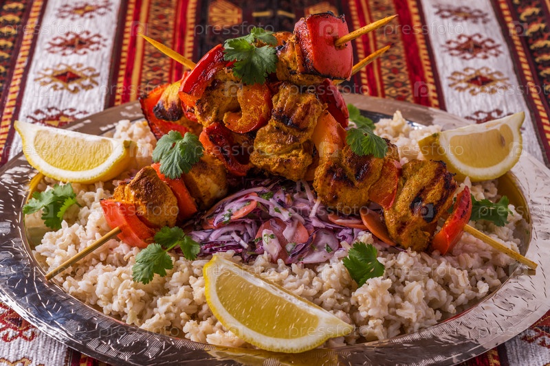 Шашлыки из курицы и овощей на гриле, подаются с рисом и салатом