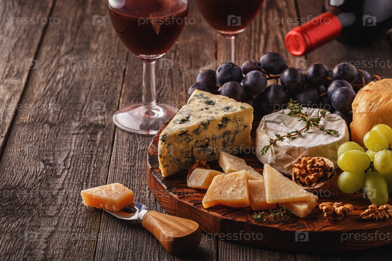 Сыр, орехи, виноград и красное вино на деревянном фоне
