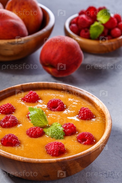 Освежающий холодный персиковый суп с малиной и листьями мяты