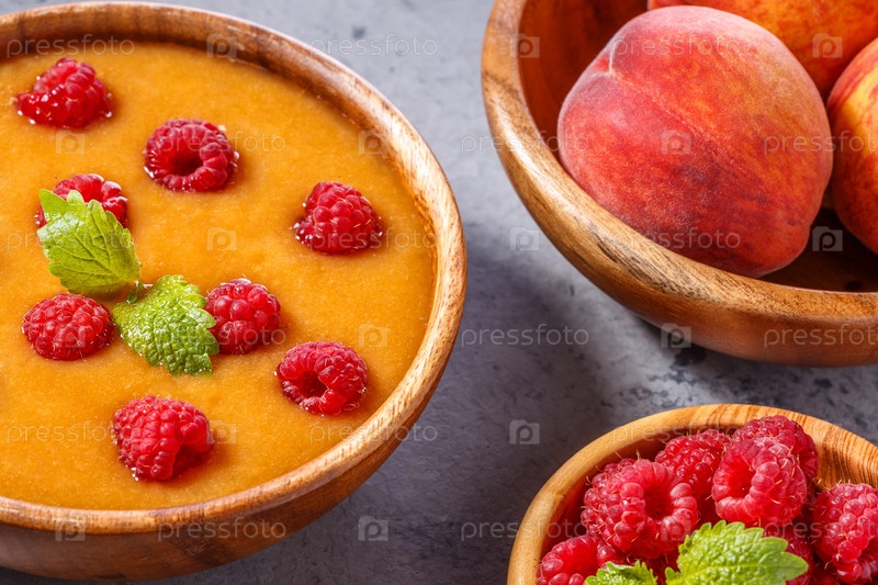 Освежающий холодный персиковый суп с малиной и листьями мяты
