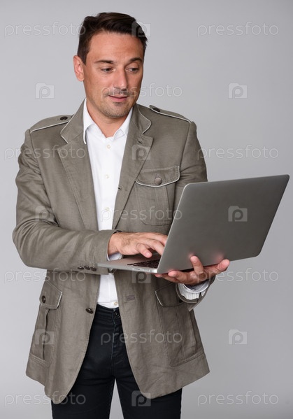 Красивый парень с помощью портативного компьютера, стоя