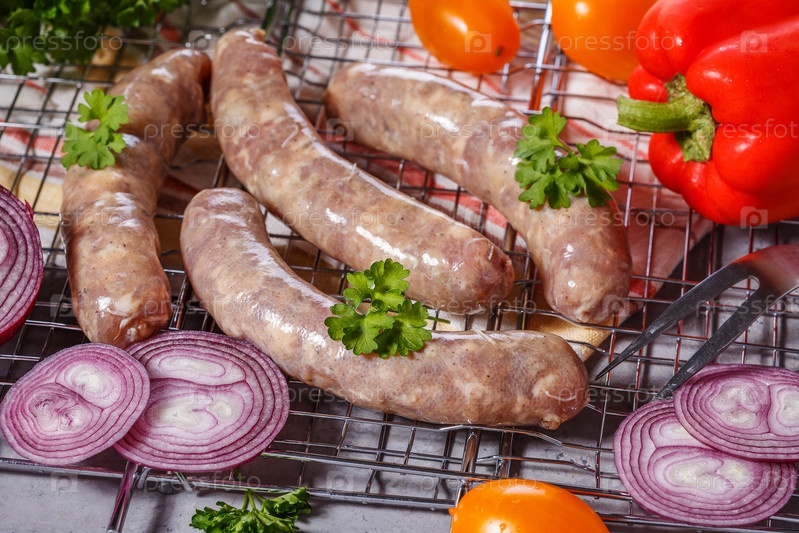 Сырые сосиски на решетке гриля