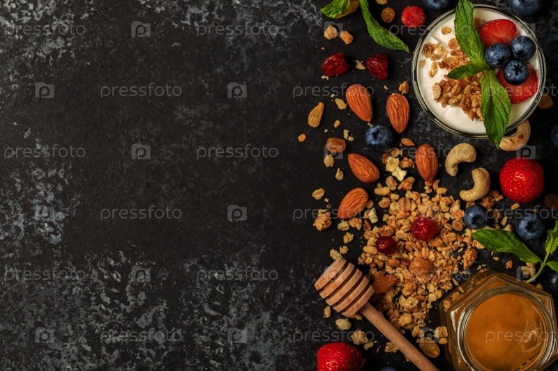 Вкусные ингредиенты (мюсли, мед, ягоды, йогурт и орехи) на завтрак