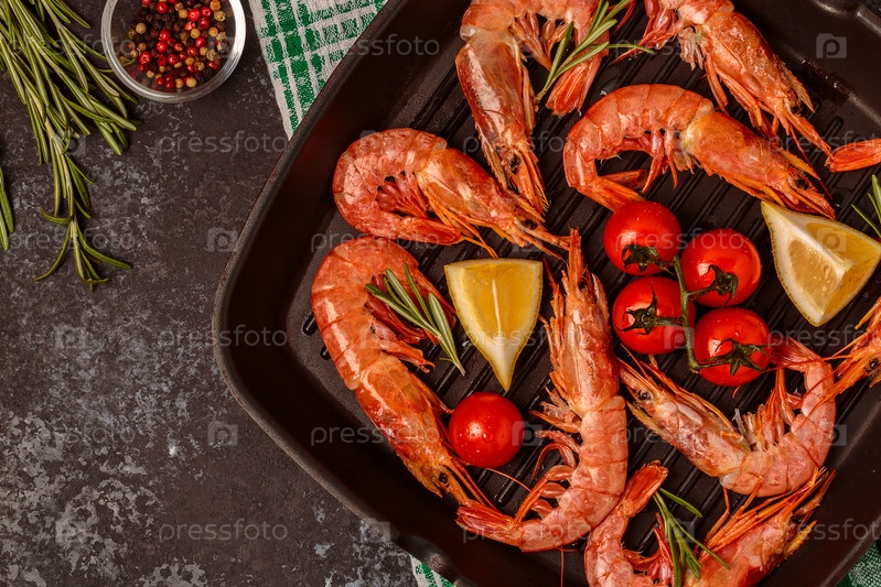 Жареные креветки с лимоном и розмарином на сковороде