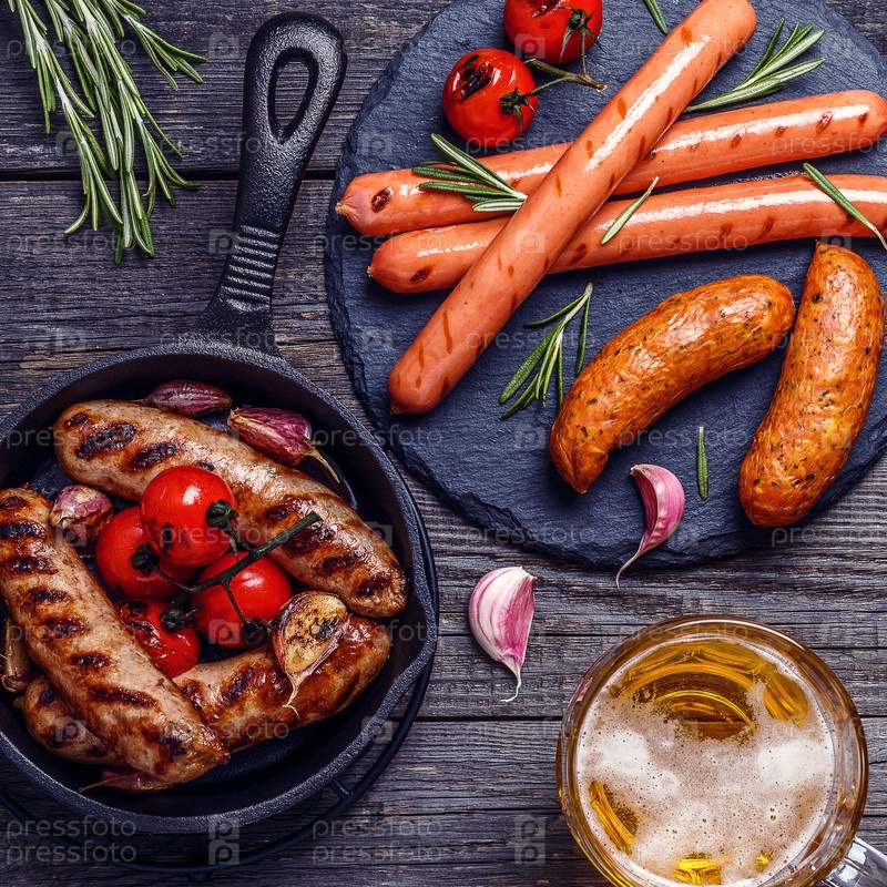 Жареные сосиски со стаканом пива на деревянном столе
