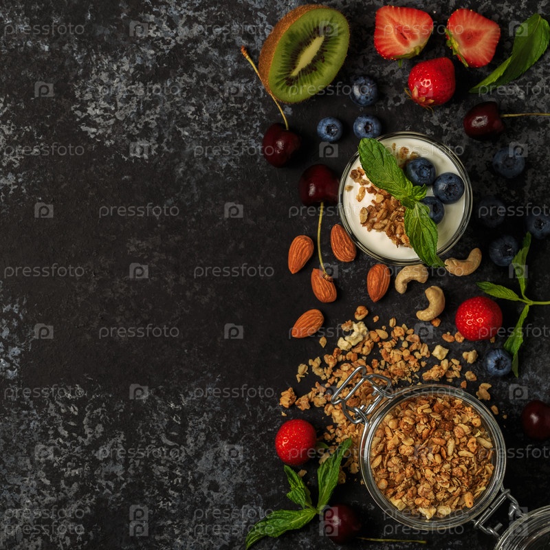 Вкусные ингредиенты (мюсли, фрукты, ягоды, йогурт и орехи) на завтрак, вид сверху