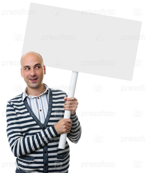 Случайный лысый мужчина держит плакат на палочке