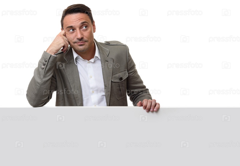 Модный красивый мужчина что-то представляет