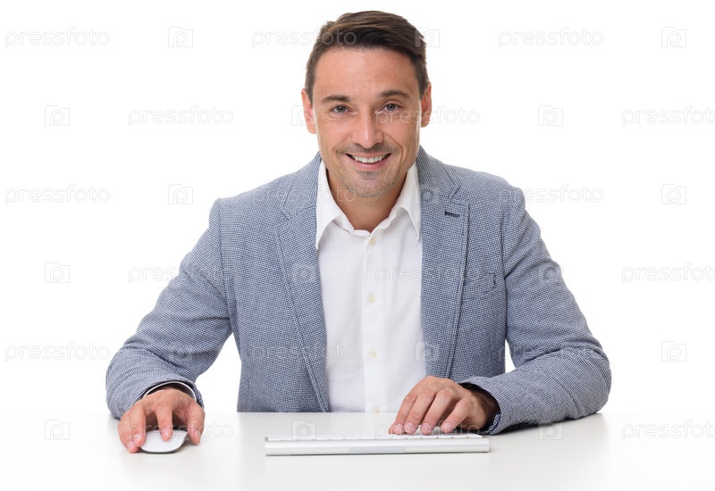 Красивый бизнесмен сидит за столом, работает на компьютере