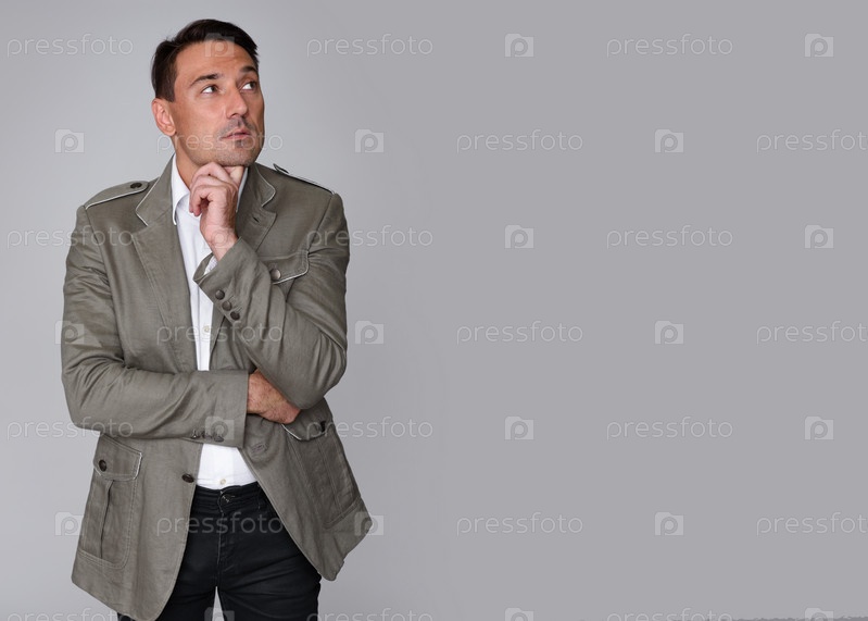 Модный красивый мужчина думает и смотрит вверх
