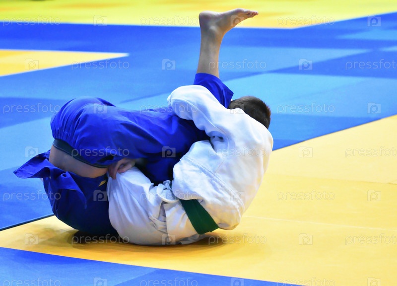 Два мальчика-дзюдоиста в дзюдоги соревнуются на татами