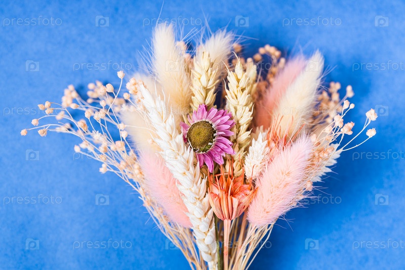 Букет сухих цветов крупным планом на голубом