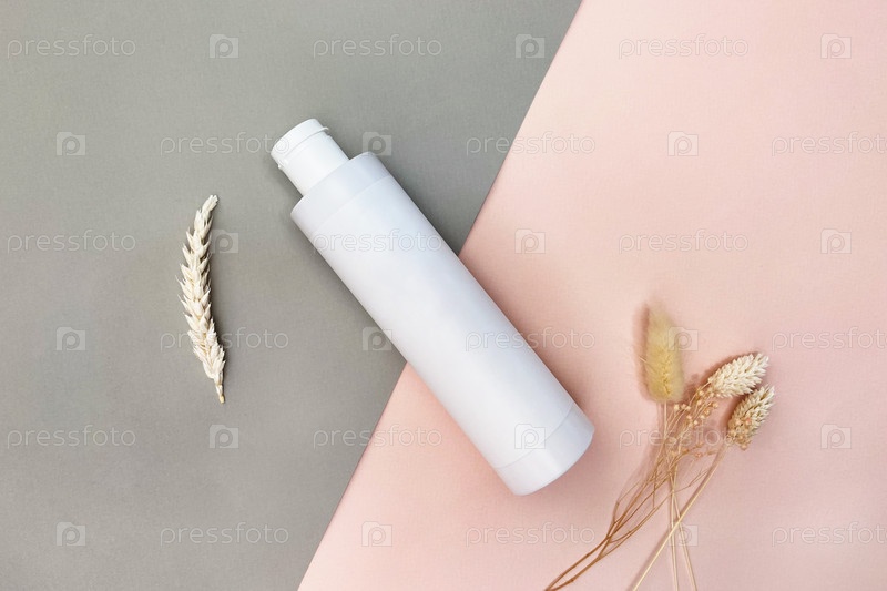 Вид сверху на белую пластиковую бутылку на сером и розовом