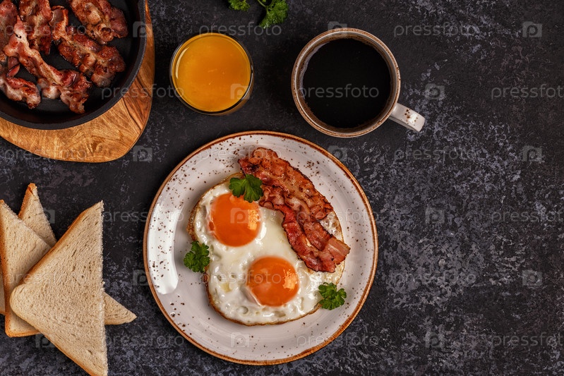 Завтрак с беконом, яичницей, кофе и апельсиновым соком