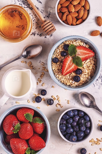 Здоровый завтрак - миска овсянки, ягод и фруктов, вид сверху