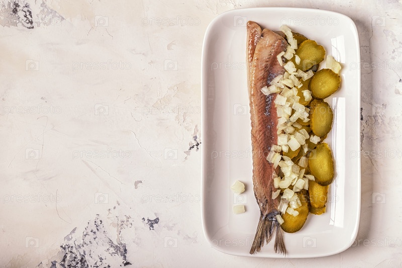 Традиционная голландская сырая сельдь с луком и солеными огурцами