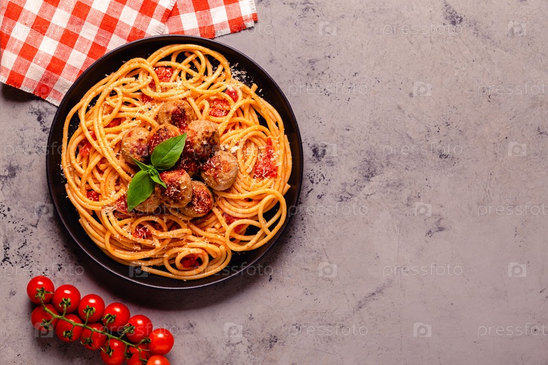 Спагетти с фрикадельками и томатным соусом на каменном фоне