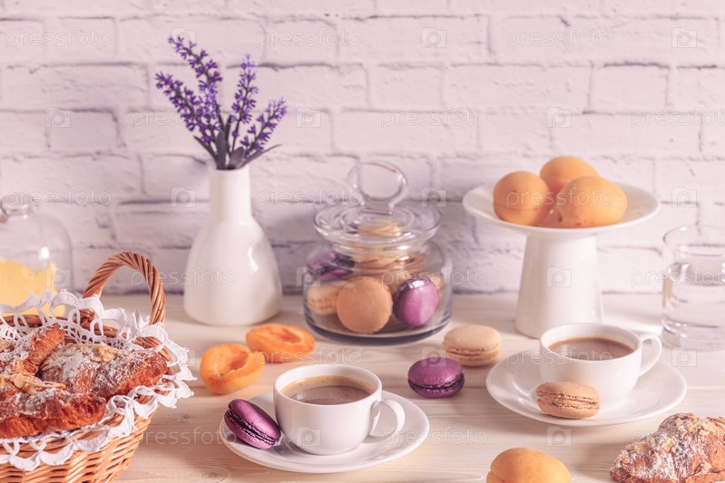 Завтрак с различными миндальными печеньями, круассанами и горячим шоколадом