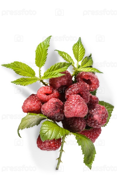 Спелая малина с листьями на белом фоне с мягкой тенью