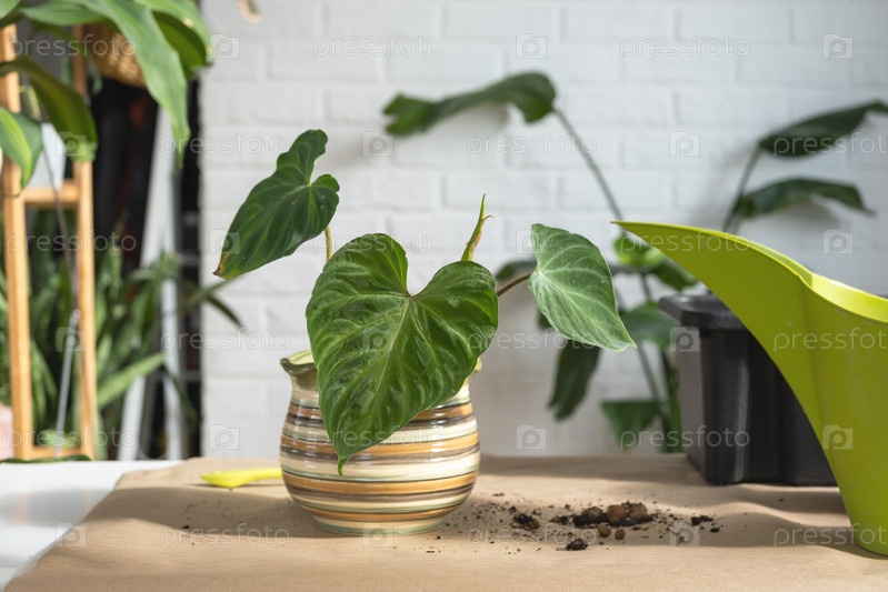 Пересадка домашнего растения Philodendron verrucosum в новый горшок большего размера в интерьере дома.Уход за растением в горшке, руки крупным планом