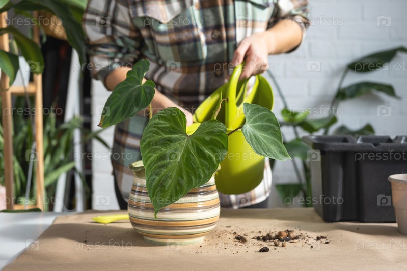 Пересадка домашнего растения Philodendron verrucosum в новый горшок большего размера в интерьере дома.Уход за растением в горшке, руки крупным планом