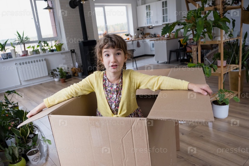 Девушка прячется в большом ящике и забавно смотрит из него в комнату внутри дома. Переезд в новый дом, распаковка вещей, сдача квартиры, ипотека, жилищный вопрос