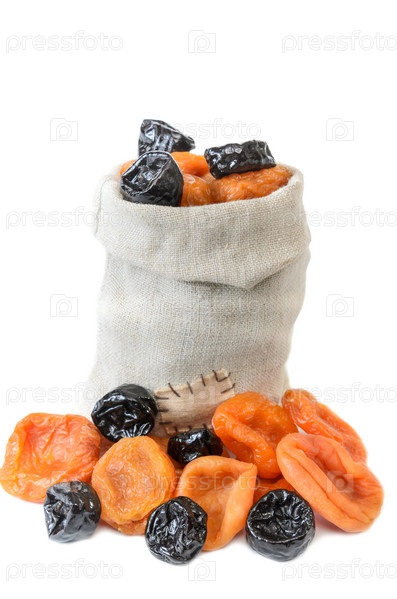 Курага и чернослив в тканом мешке на белом фоне с мягкой тенью