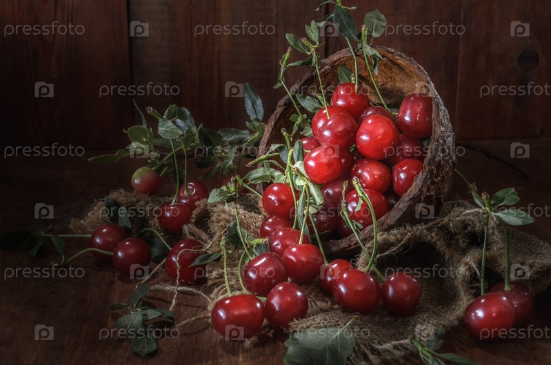Спелые ягоды сочной вишни на темном деревянном фоне