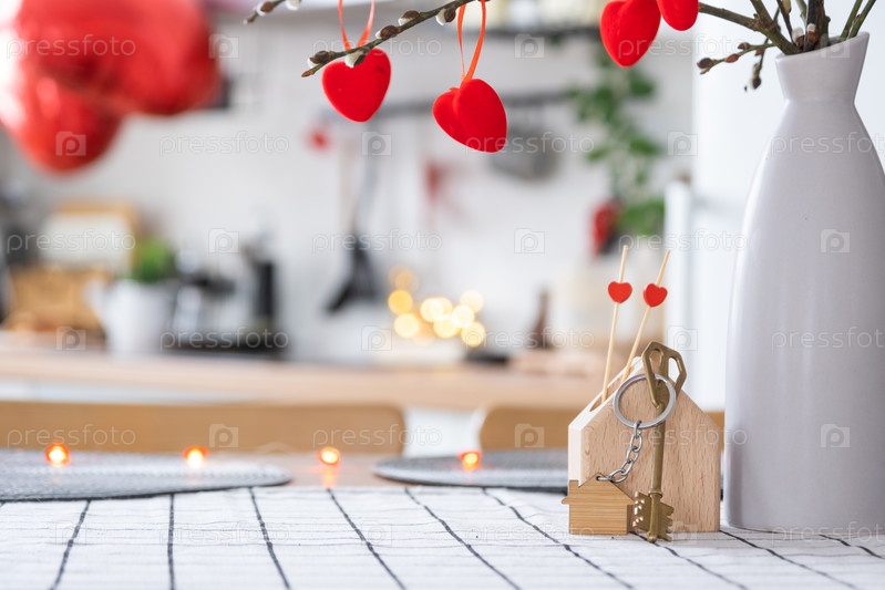 Ключ к дому уютного дома с декором Валентина на кухонном столе. Подарок на день святого валентина, семейное любовное гнездышко. Строительство, дизайн, проект, переезд в новый дом, ипотека, аренда и покупка недвижимости