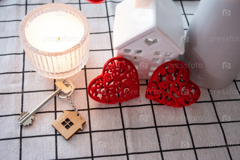 Ключ к дому уютного дома с декором Валентина на кухонном столе. Подарок на день святого валентина, семейное любовное гнездышко. Строительство, дизайн, проект, переезд в новый дом, ипотека, аренда и покупка недвижимости