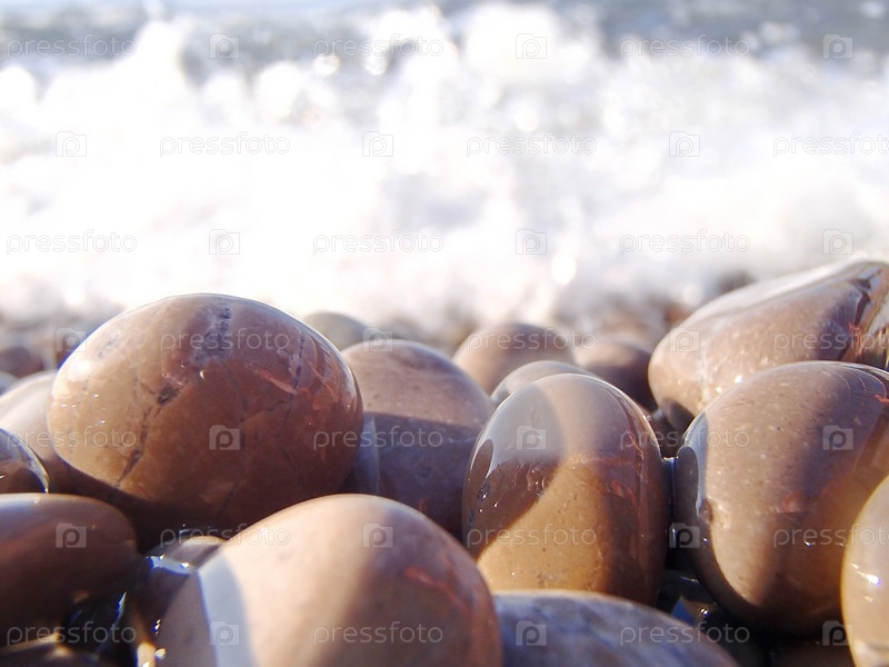 Морской прибой. Волна накатывается на галечный пляж. Солнечные блики на поверхности моря