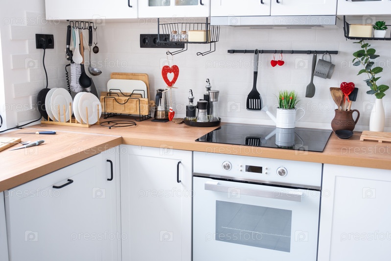 Интерьер кухни в доме украшен красными сердечками ко Дню святого Валентина. Декор на столе, плита, посуда, праздничное настроение в семейном гнездышке