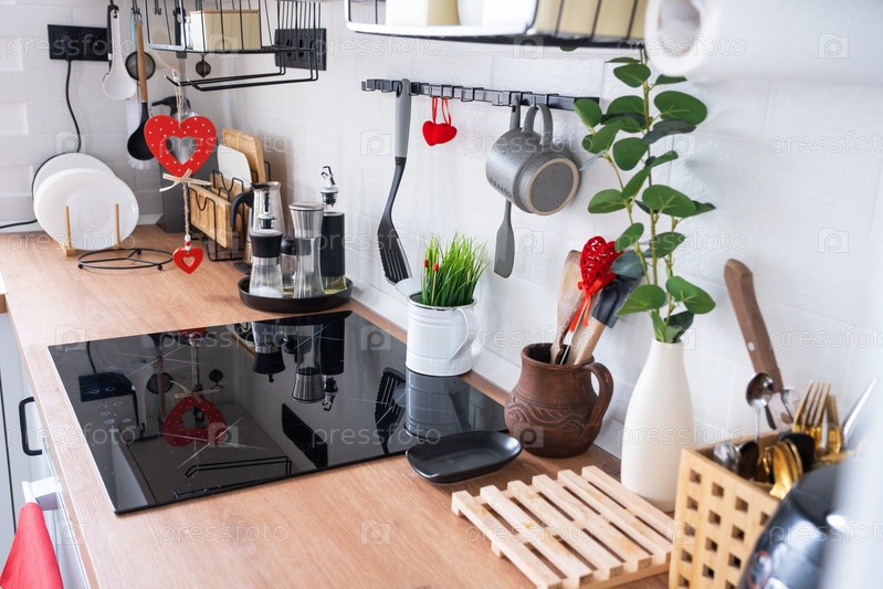 Интерьер кухни в доме украшен красными сердечками ко Дню святого Валентина. Декор на столе, плита, посуда, праздничное настроение в семейном гнездышке