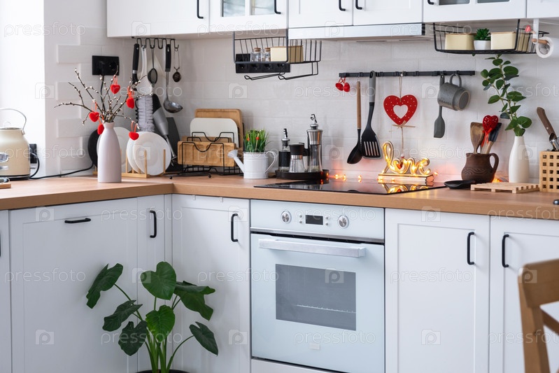 Интерьер кухни в доме украшен красными сердечками ко Дню святого Валентина. Декор на столе, плита, посуда, праздничное настроение в семейном гнездышке