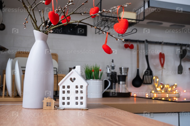 Ключ к дому уютного дома с декором Валентина на кухонном столе. Подарок на день святого валентина, семейное любовное гнездышко. Строительство, дизайн, проект, переезд в новый дом, ипотека, аренда и покупка недвижимости