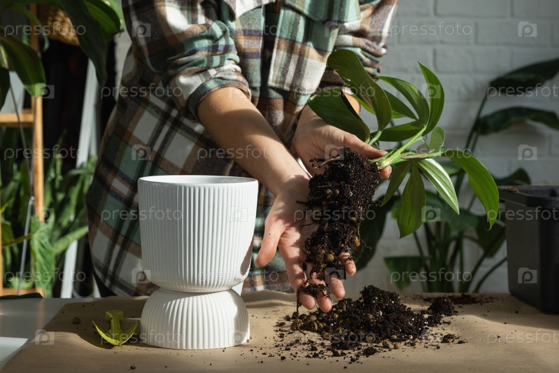 Пересадка домашнего растения Филодендрон Драконий Хвост в новый горшок в интерьере дома. Уход за растением в горшке, руки крупным планом