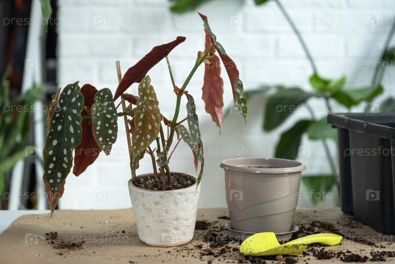 Пересадка домашнего растения Бегония пятнистая в горшок с мордочкой. Женщина сажает стебель с корнями в новую почву. Уход за растением в горшке, руки крупным планом