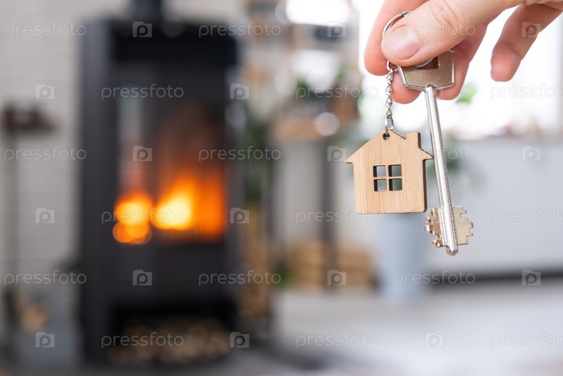 Ключ от дома с брелком в руке владельца против каминной печи с огнем и дровами. Уютный домашний очаг. Строительство, дизайн, проект, переезд в новый дом, ипотека, аренда и покупка недвижимости