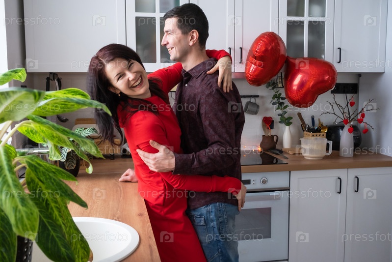 Влюбленные мужчина и женщина встречаются дома на кухне в счастливых объятиях. День святого Валентина, счастливая пара, история любви. Любовное гнездо, жилье для молодой семьи