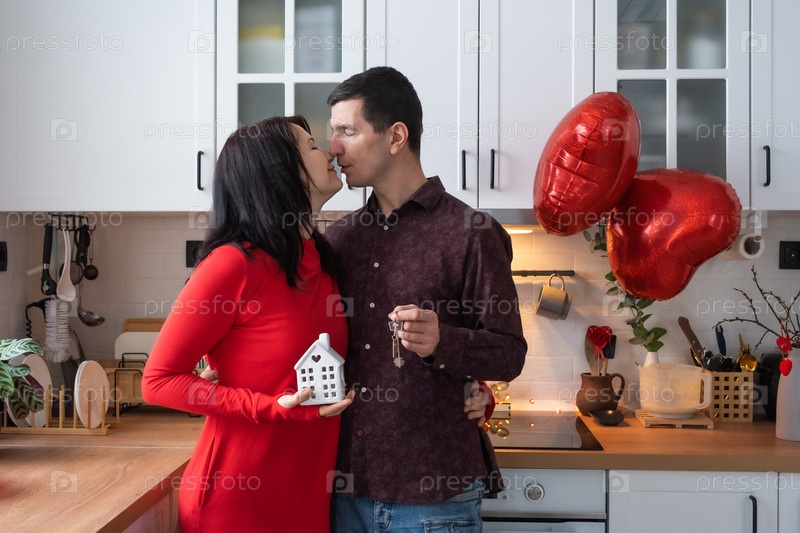 Влюбленные мужчина и женщина встречаются дома на кухне с ключами от дома. День святого Валентина, счастливая пара, история любви. Влюбленное гнездышко, ипотека, переезд, покупка, недвижимость, жилье для молодой семьи