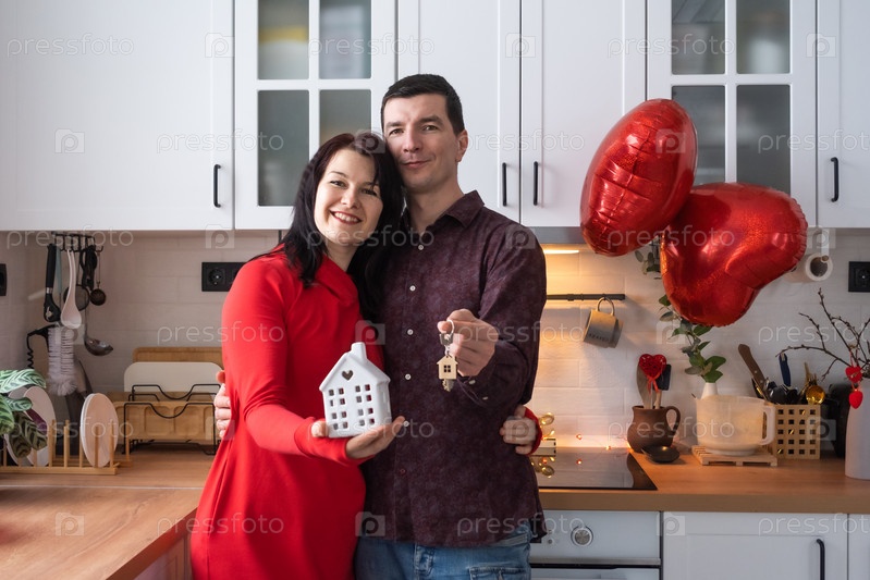 Влюбленные мужчина и женщина встречаются дома на кухне с ключами от дома. День святого Валентина, счастливая пара, история любви. Влюбленное гнездышко, ипотека, переезд, покупка, недвижимость, жилье для молодой семьи