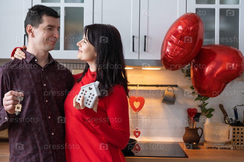 Влюбленные мужчина и женщина встречаются дома на кухне с ключами от дома. День святого Валентина, счастливая пара, история любви. Влюбленное гнездышко, ипотека, переезд, покупка, недвижимость, жилье для молодой семьи